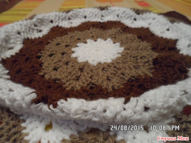 ! Последний раз, когда я его распускала, был уже почти довязан до нужного размера, но как оказалось у меня получился не коврик, а шляпа. Да, да, она самая, если на поверхности раскладываю ровно середину, то края дыбом, если раскладываю края, то середина дыбом: