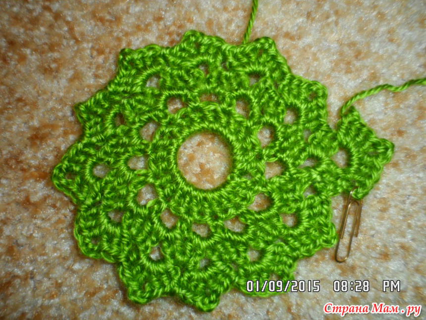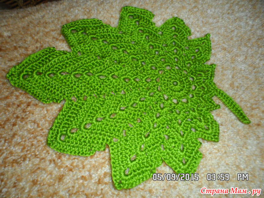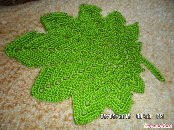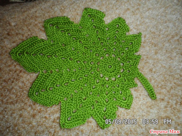 предложила мне схемку листочка. Тоже вроде бы как и простенькая. Тут уже стало немного попроще, но не могу сказать, что совсем уж просто. Начало было таким:Мне не совсем понравилась в середине дырка, хотя так было по схеме, но всё же я распустила и сделала традиционную серединку и вот, что у меня получилось в итоге: