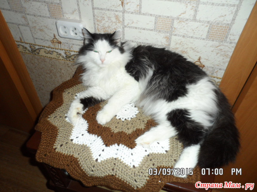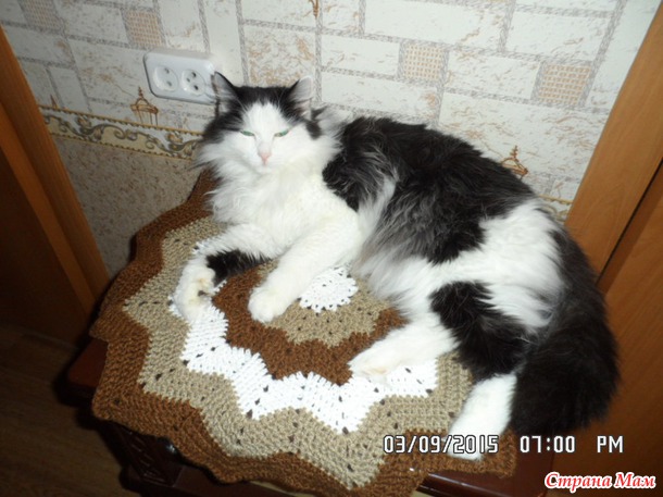 . Распустила, смотала клубочки, убрала, НО ведь упёртость так и грызла меня изнутри. Я начинала снова и снова, пробовала то так, то эдак и чудо свершилось, коврик удался, по крайней мере меня он вполне устраивает:да и нашего домашнего любимца по-моему тоже: