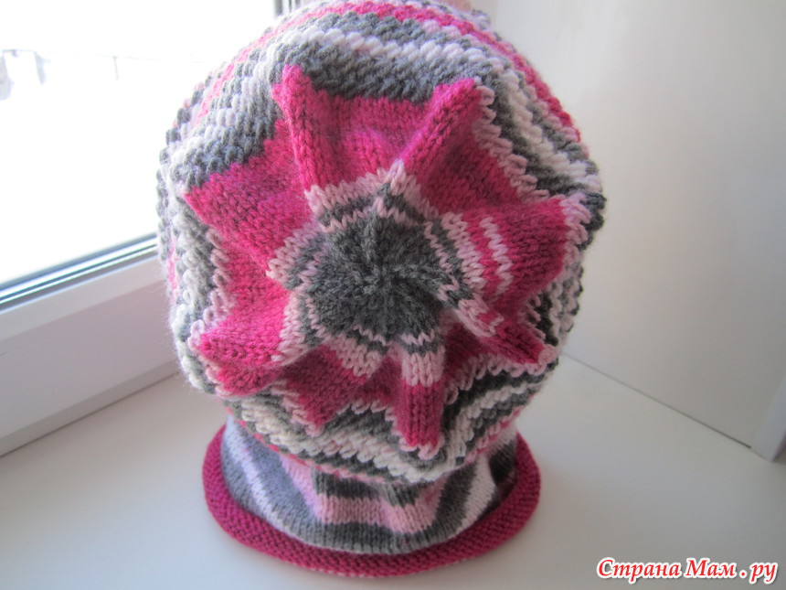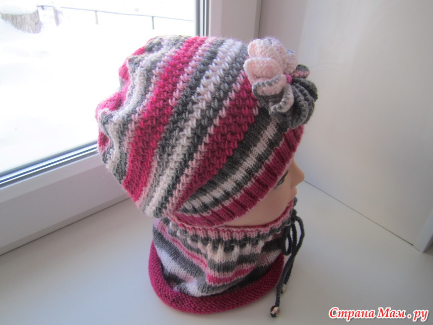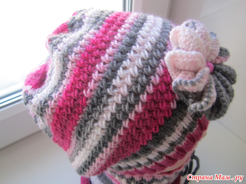 На комплект ушло два моточка. Нитка в работе очень понравилась, ложится ровно, мягкая, не хрустит. Украшение и помпон съёмные.