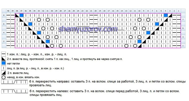 Набрать 40 п. + 2 кром. и вязать согласно схеме, на которой приведены лиц. и изн. р.