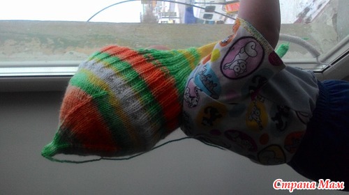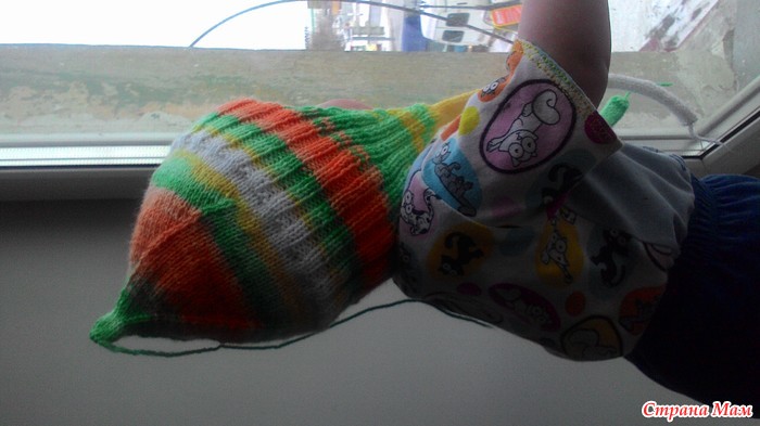 Отверстие на правой варежке я делаю на начальных петлях 4 спицы (для 2-3 лет 3-4 петель для этого достаточно).
