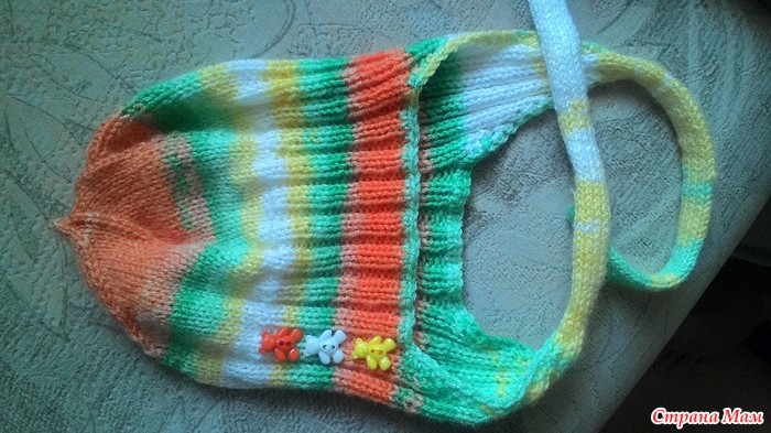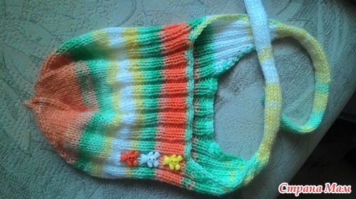 По бокам из полотна надо поднять по 1-2 петельки. Присоединяем нить и вяжем по получившимся петлям по кругу до нужной высоты, затем убавляем петли до 4-6, оставшиеся стягиваем нитью и закрепляем с изнанки.