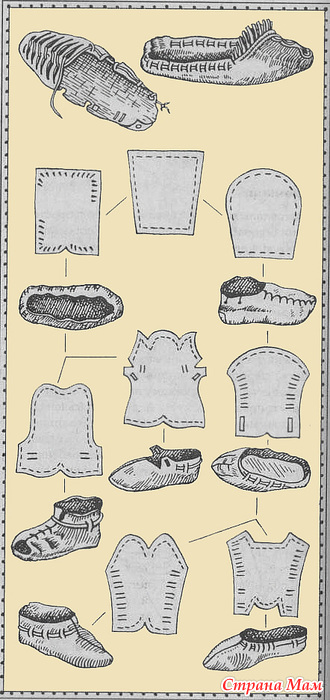 Схема снятия шкуры и изготовления обуви из "естественных" заготовок.