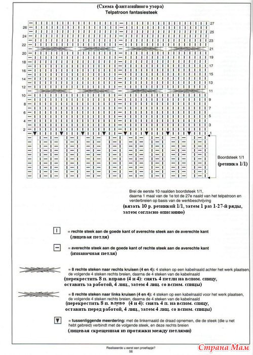 Затем вязать фантазийным узором спицами № 5.5, прибавив в 1-м р. 32 п.: см. схему; а именно выполнить: