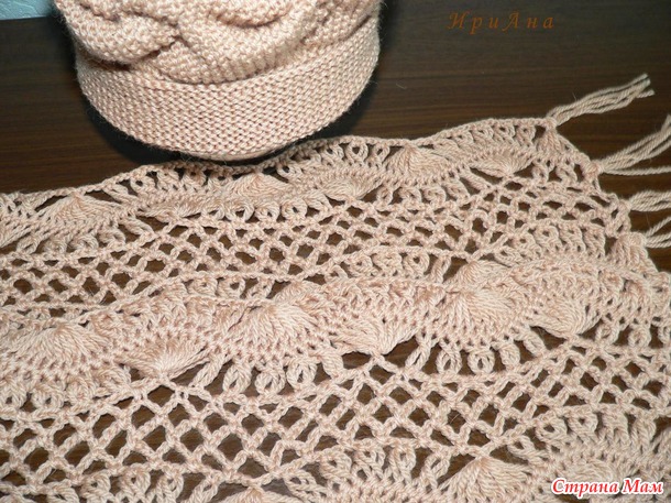 Кремовая шапочка связана спицами, шарф на вилке. Пряжа из Троицка "Подмосковная".