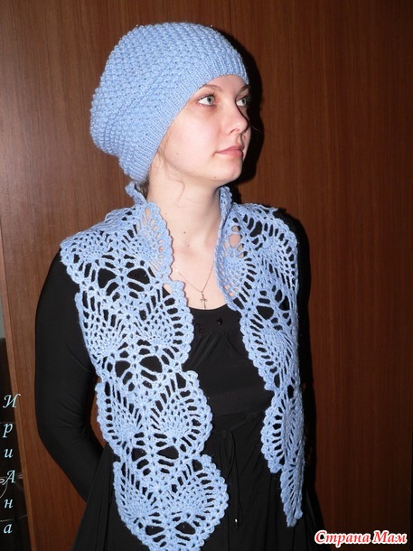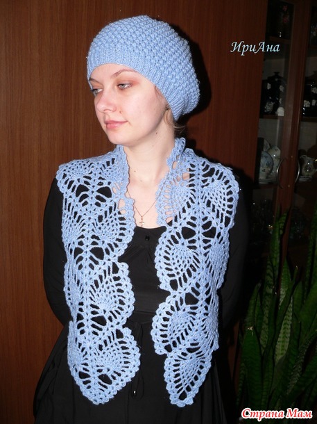 Голубой набор тоже маме, сфотографировали на Алёнке. Берет спицами узором "Букле", шарф крючком ананасиками.