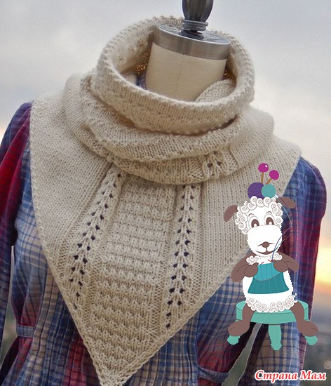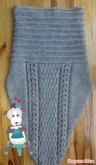 Вязала вкруговую, без пуговиц. Набрала 72 петли (вполне можно набрать на 6-10 петель меньше, если хочется чтобы прилегал плотнее) и вязала саму трубу лицевой гладью, каждый пятый ряд - изнаночный. Прибавляла в каждом пятом ряду по две петли взади, относительно центральной. На оригинале - 9 изнаночных рядов, у меня - 10. После десятого изнаночного ряда я закрыла сзади 28 петель и начала вывязывать треугольник.
