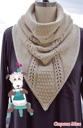 Из-за этих закрытых петель снуд лучше лежит на груди. Центральный узор - по схеме. Убирала в каждом четвертом ряду по одной петле с каждого края. Дойдя до центрального узора - убирала в каждом втором ряду.