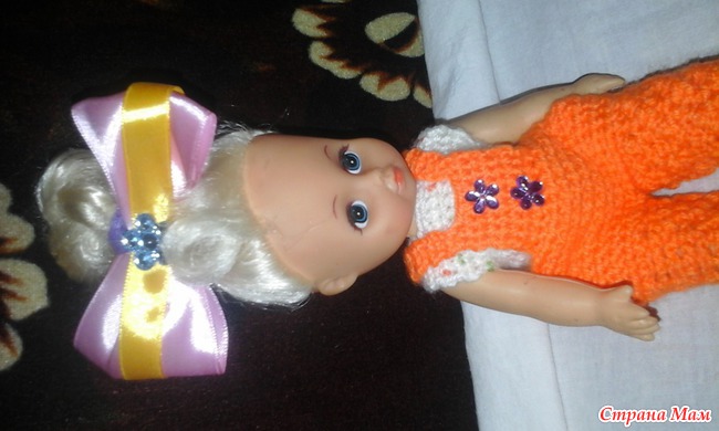 Совсем не хочется творить, совсем... Не лежит душа. Бывает такое иногда и называю такое состояние Творческий кризис. Однако среди дочиных игрушек обнаруживаю, что одна кукла осталась без платья. Очень жалею голеньких кукол, наверно потому что они напоминают мне детей и кажется, что они мерзнут. И вот что из этого вышло... На автопилоте так же соорудила бант.