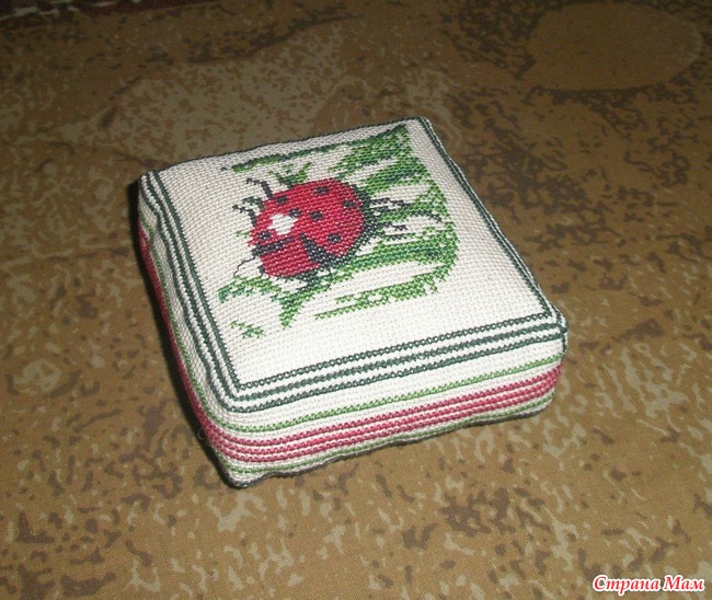 Решила опробовать новую форму - матрасик. Схему брала из французкого журнала, а боковинки решила сделать полосками, чтобы напоминала настоящий. Части проклеены флизелином дважды, но все равно должного уплотнения не получилось, бока морщинятся. Нитки подбирала на свое усмотрение.