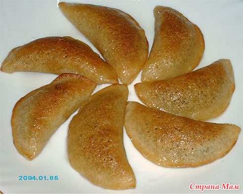 Когда мы сделаем это, то получим как-бы кулёчек, в который положим начинку и продолжим защипывание блинчика до конца. В результате у нас получится пирожок, похожий на вареник,