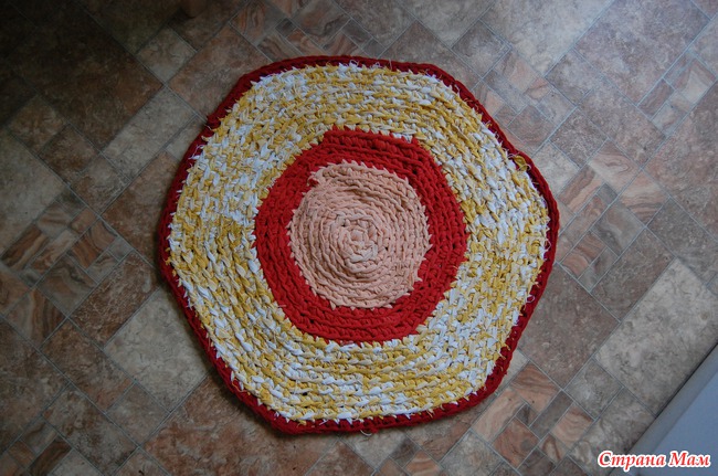 Я с таких ковриков начинала вязать в 5 лет, бабушка научила. Только трикотаж тогда в дефиците был-просто старую ситцевую одежду резали на длинные полоски, связывали между собой и веретеном скручивали.