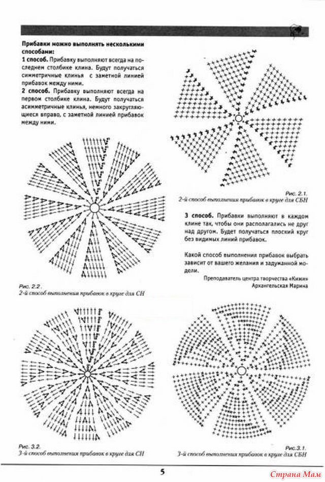 закон круга: При вязании по кругу нужно прибавлять в каждом круге разное число петель в зависимости от рисунка. Если круг выполняется из столбиков без накида, то следует равномерно прибавить 6 петель на круг, если из полустолбиков, го 8 петель, если из столбиков с накидом, то 12 петель, если из столбиков с двумя накида-ми, то 16 петель. И далее, при увеличении числа накидов в столбиках прибавляется по 4 петли на круг при добавлении очередного накида. Для того, чтобы прибавить петлю, нужно вывязать два столбика из одной точки, т.е. связать два столбика с общим основанием.