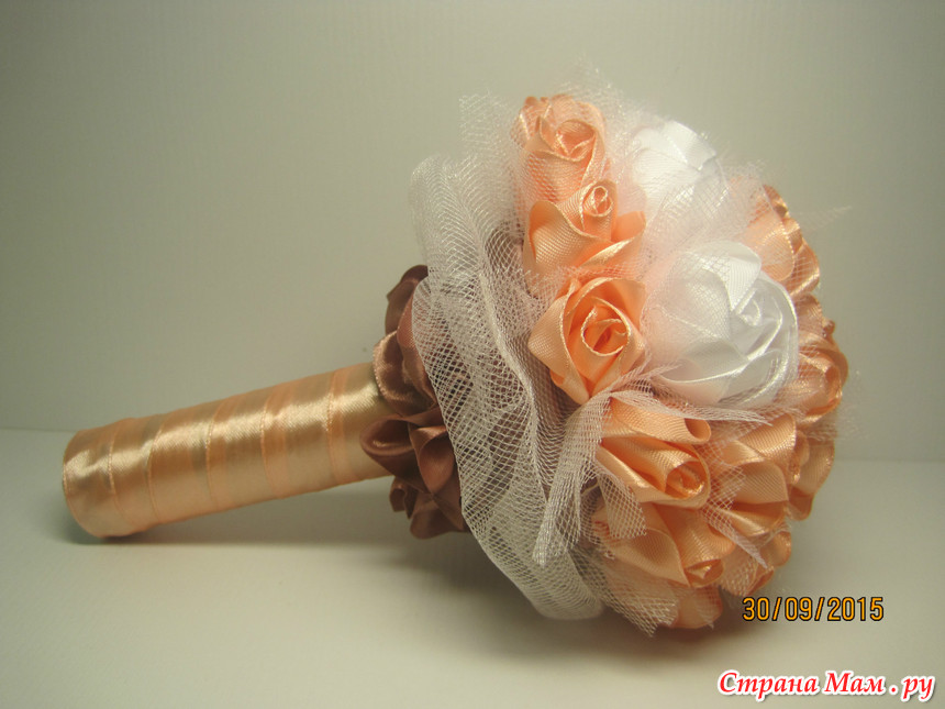 Здравствуйте. девочки! Сделала несколько букетиков по просьбе подруги. Использовала ленту 2.5см. отрезки 7см.