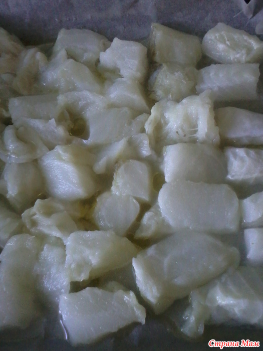 Филе режем на не большие кусочки, солим, перчим и укладываем в форму, смазанную маслом.