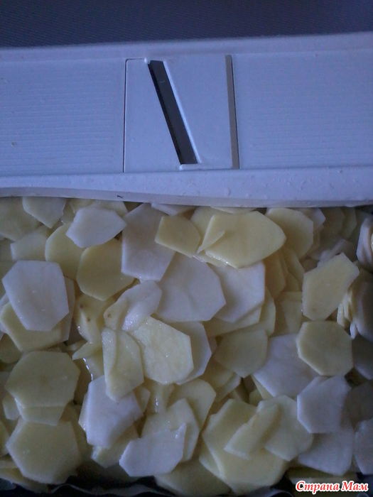Картофель нарезаем тонко, я воспользовалась специальной тёркой и получились тонкие кружочки