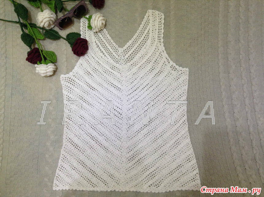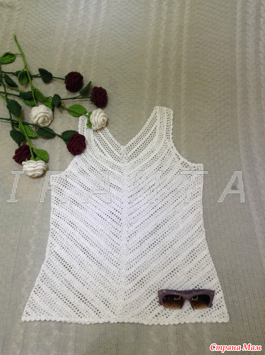 1. Самый простой, но очень удобный и практичный топ "Филейная диагональ". Пряжа Троицкая "Ленок", 70% хлопок, 30% лен. 550 м на 100 гр, цвет "Отбелка", де-факто это скорее "молоко". Крючок № 1,25, расход 220 г на разм. 48-50. Длина топа 67 см.