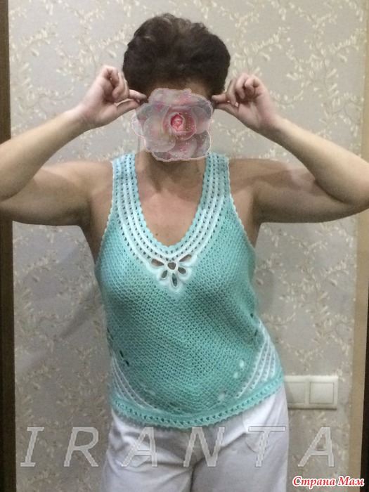 Очень мягкий, нежный, удобный и смотрится чудесно! Спинка открыта, на 2-ух пуговичках, бретель вокруг шеи.. Пряжа Троицкая "Ветерок", 100% вискоза, 325 м на 100 г, секционка, крючок № 1,5. Расход 100 г на разм. 44, рост 160. Длина топа - 42 см, Топик, конечно, для молодых и стройных, поэтому подклад не предусмотрен - все и так отлично, все прикрыто в меру