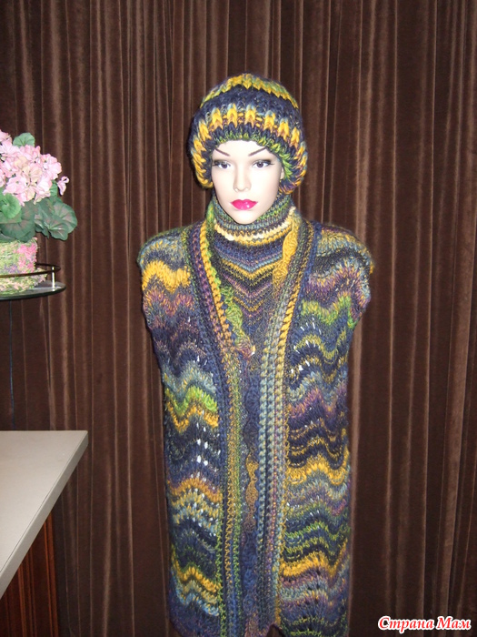 Очень люблю безрукавки и всё время их вяжу то крючком, то спицами. Хочу показать Вам вот такой наборчик. Здесь очень красивая итальянская пряжа называется OLYMPIA Lana Grossa 53% шерсть, 47% акрил 100 грамм 100м. Вязала спицами. Рекомендованный размер спиц: 8-10 мм. Плотность вязания: 10 п. х 14 р. Воротничок вязала спицами №5 поплотнее. Шапка связана английской резинкой с накидом 1х1.