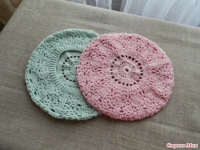Желтый берет связан по той же схеме, нитки взяты потоньше