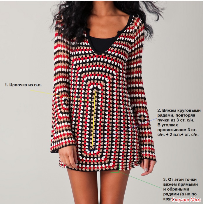 За основу взят обычный узор "бабушкин квадрат". Но работу начинаем из цепочки воздушных петель ( см. последнее фото с описанием).