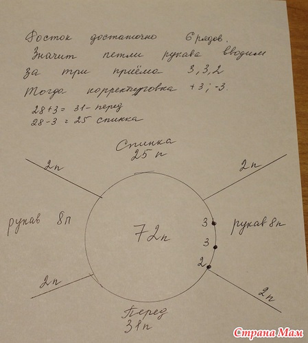 Набрала 72 петли, 24 спинка, 32 перед, рукава по 8 петель, реглан 8 петель.