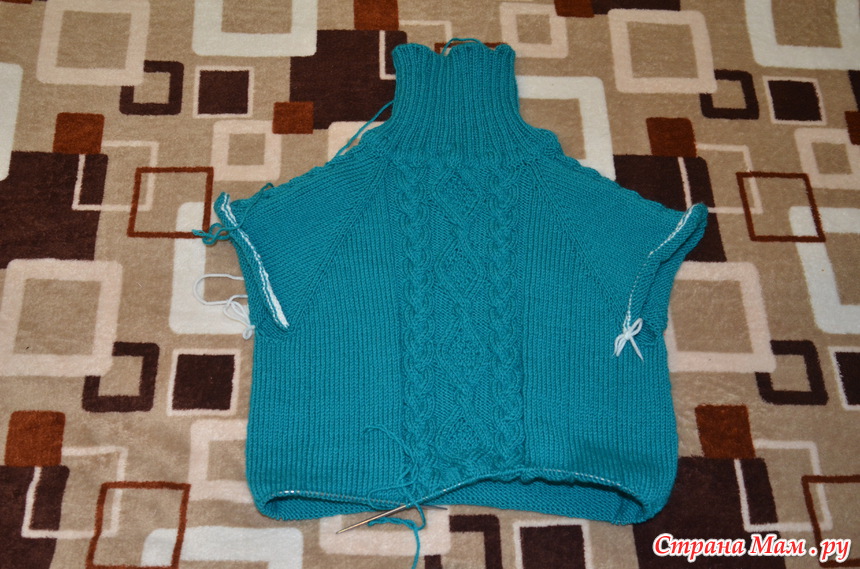 Росток связан, замыкаем и продолжаем круговое вязание. При этом количество петель спинки = количеству петель переда = 37, количество петель рукава – 15.