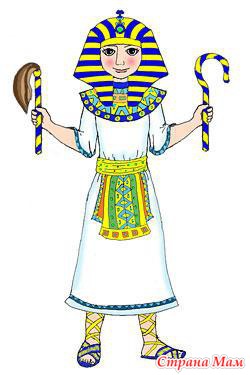 Звучит мелодия из Египта. Заходят 2 наложницы и за ними — фараон. Одежда — из простыней, обмотанных вокруг тела. Один конец простыни крепится на плече. На голове фараона — корона, обвитая змеей. У наложниц вместо вееров — веники. Они метут дорогу фараону, потом будут обмахивать фараона этими же вениками вместо пальмовых листьев.