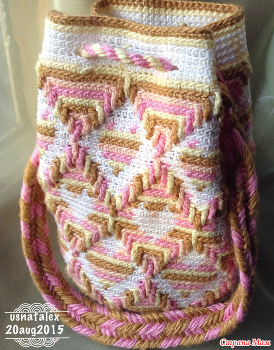 Мой маленький вклад после долгого отсутствия. Эту мини-мочилу я вязала не потому, что она была нужна, а потому что давно хотелось попробовать в одном образце совместить две техники - Appache Tears и тапестри.