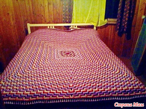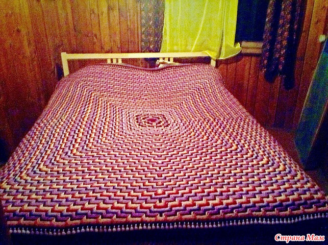 Техника с использованием вытянутых петель для создания рисунка, конечно, хорошо известна, и М.Трикоз использованы существующие варианты узоров (их много публиковалось в журнале Дуплет). В Appache Tears, разразработанном Сарой Лондон, конечно, используются вытянутые петли (на три ряда ниже в данном случае), но это вполне определенный рисунок и объем. Вот плед, который я связала в технике Appache Tears, но не с отрывом нити, как это в ней принято, а из центра и по кругу. В моих публикациях (дневник и группы, фотоальбом) есть и жилет в данной технике, и шапка "Клоше-зигзаг".