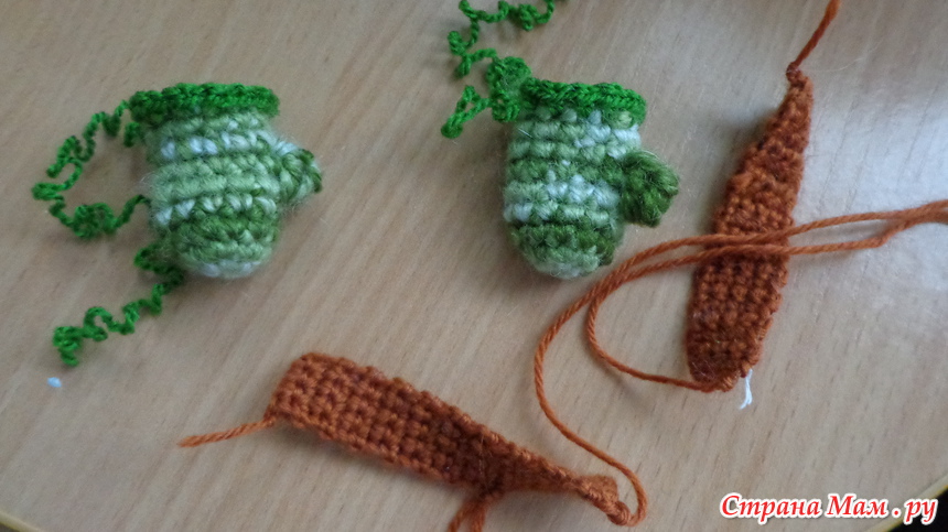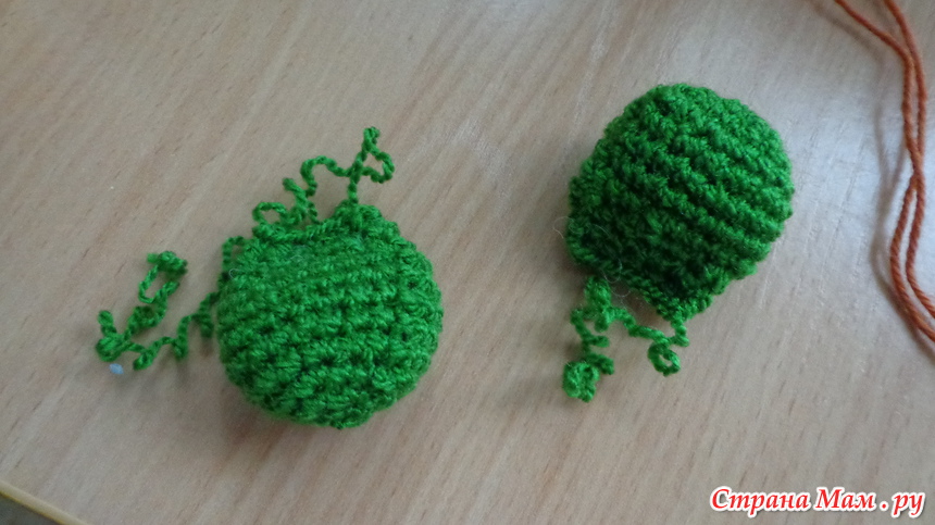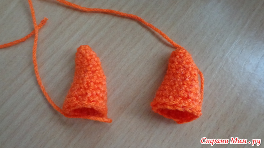 Набиваем деталь, складываем пополам и провязываем две стороны вместе 6с оставляем длинный кончик нити для сшивания деталей