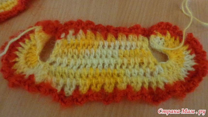 9 ряд меняем нить на другого цвета - столбик без накида и 1 воздушная петля.- в каждую петлю.