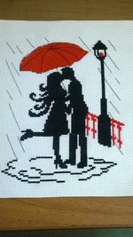 Девчонки, вышивала на мечту в октябре. Схему выбирала другую - тоже пару под дождём, но как эту увидела всё пропала. Канва нежно розовая. Вот что получилось, сегодня отдала в багетку, оформлю похвалюсь!