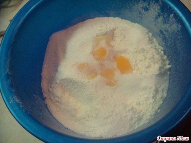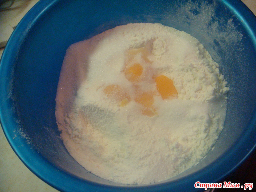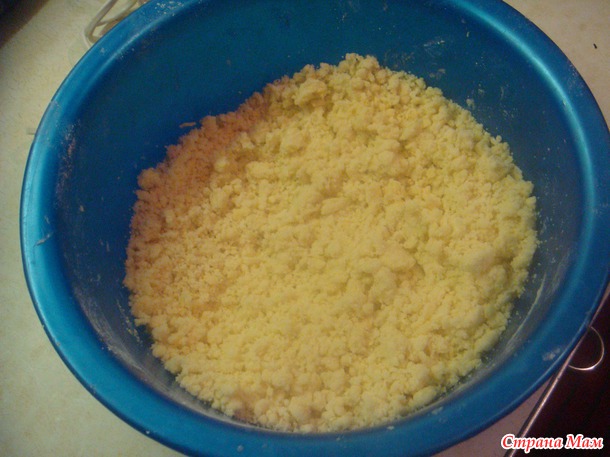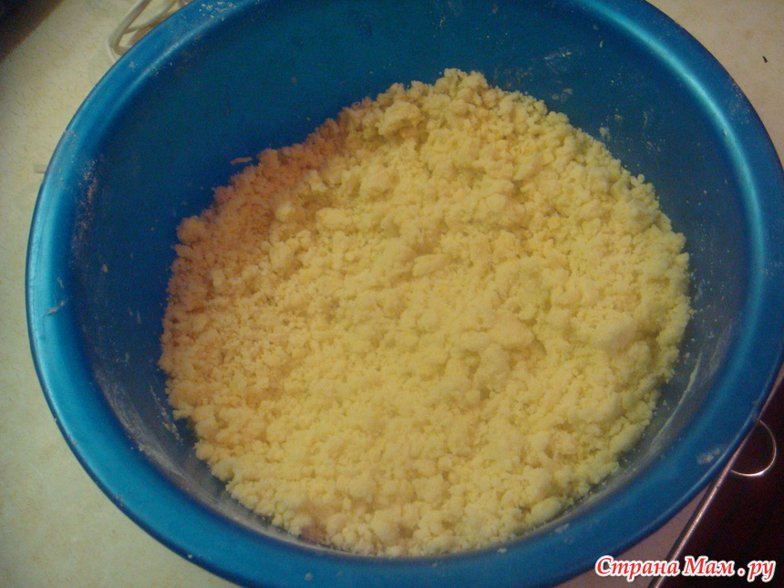 Натереть маргарин и перетереть все в жирную крошку. Если будет необходимость можно добавить еще муки.