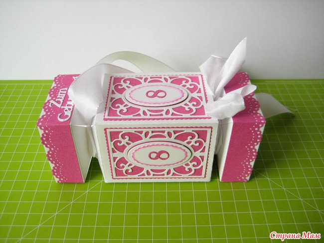 В нижней части упаковки сделала донышко. Верхний бантик не стала завязывать, чтобы не помять ленту. (упаковка без подарка)