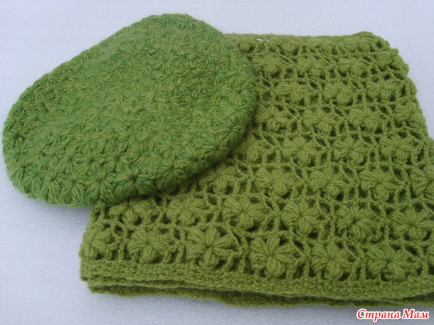 Связала два цветка-броши. Схемы для снуда и берета брала в интернете. Тут узор для снуда http://domihobby.ru/446-uzor-kryuchkom-s-obemnymi-cvetami.html, есть подробное видео на ютубе.