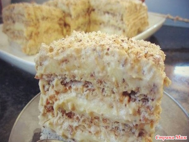 Сверху на заварной крем распределяем хрустящий наполнитель. И так повторяем еще 2 раза: корж, заварной крем, хрустящий наполнитель.