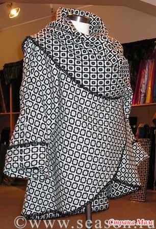 Нткнулась в инете на интересную накидку .Можно её сшить из двухсторонней шерсти, темно и светло серой, смотрится - обалдеть. Если при невысоком росте одевать ее длинной частью вниз, то получается длинный жилет, а если наоборот, то воротник прикрывает руки, и возникают "рукава". Универсальная накидка пригодится как в домашнем гардеробе, так и на работе!(это говорится о модели без рукавов!!!)