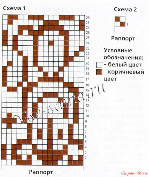 На носочные спицы №3,5 наберите коричневой нитью 48 п., равномерно распределите петли на 4 спицы (по 16 п.). Вяжите вкруговую 7 рядов резинкой 1x1. Затем поменяйте спицы на №4 и вяжите лиц. гладью 2 ряда белой нитью. Далее начинайте вывязывать рисунок по схеме 1, начиная с 1-го ряда и повторяя раппорт в ширину 3 раза. В высоту провяжите 1-29-й ряды. Затем провяжите еще 2 ряда белой нитью, при этом во 2-м ряду равномерно убавьте 4 п. = 44 п. Поменяйте спицы на №3,5, вяжите 1 ряд коричневой нитью. Равномерно распределите петли на 4 спицы (по 11 п.). Смена ряда – между 1-й и 4-й спицами. Провяжите 7 рядов лиц. гладью.
