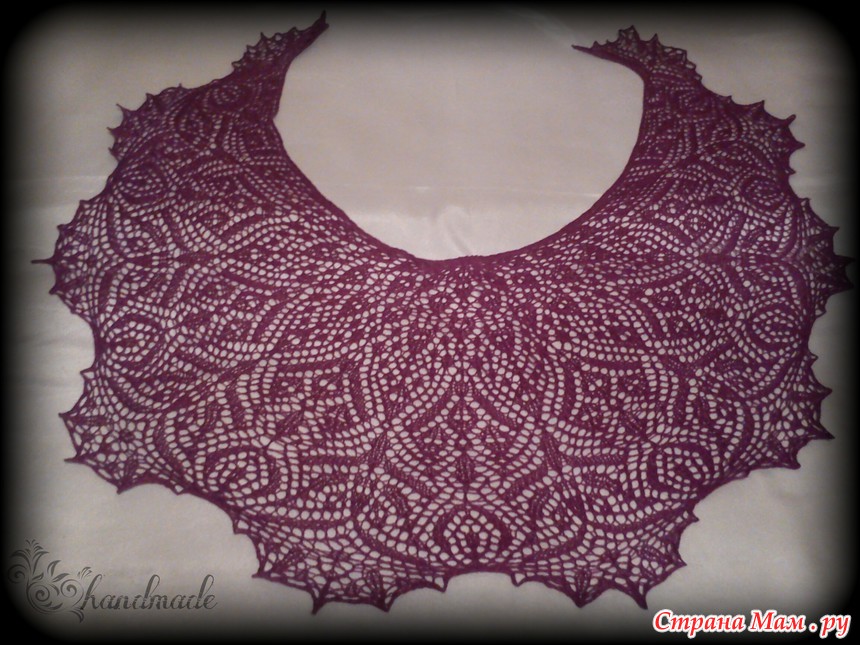 Теперь технические характеристики: расход пряжи 87 гр, расход бисера 34 гр, спицы #3,5, размер по центру около 45 см, по внутренней дуге около 120 см, цвет пряжи темная орхидея (о как)