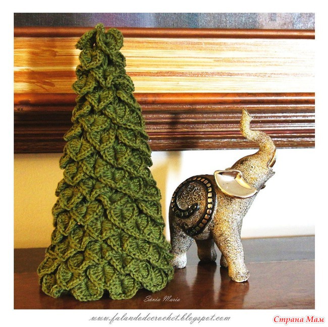 Отличный стильный вариант елочки для любительниц вязания крючком. Узор очень похож на крокодиловую кожу, кстати, его многие именно так и называют) Автор работы - португальская мастерица S^onia Maria, составила схему вязания, причем подробно, для каждого ряда елочки. За что, большое ей спасибо! С очень красивым узором думаю у вас не возникнет никаких особых сложностей, в работе использованы воздушные петли и столбики, с одним и с двумя накидами. Если вязать по схеме крючком 2,75 мм, то у вас получится елочка, высотой около 25 см.
