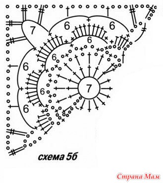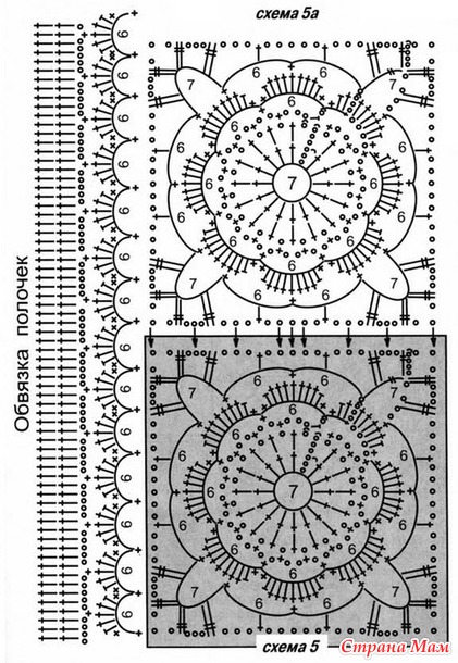 Вяжите мотивы, соединяя между собой в местах, обозначенных стрелками, как показано на схеме 5а. Для чего вместо средней ВП арочек из 3-х ВП вяжите соединительный столбик в среднюю ВП симметричной арки соседнего квадрата. В арочках их 5ВП вместо 3-х центральных петель вяжите 3 соединительных столбика в соответствующие ВП соседнего мотива.