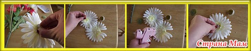 У цветка убираем сердцевину, соцветие. Склеиваем все лепестки суперклеем, а в середину вклеиваем стразу.