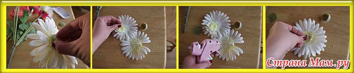 У цветка убираем сердцевину, соцветие. Склеиваем все лепестки суперклеем, а в середину вклеиваем стразу.