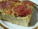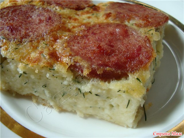 В форму, смазанную маслом или маргарином вылить тесто и сверху положить кружочки колбасы.