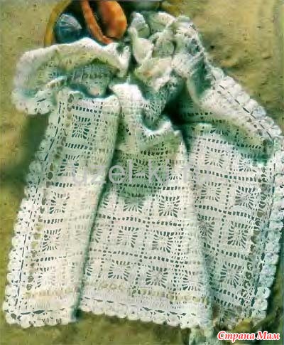 Набрать цепочку из 167 в. п. + 3 в. п. подъема, вязать 1 р. ст. с/н, продолжить вязание узором по схеме 1. Выполнить в высоту 12 раппортов, связать 1 р. ст. с/н и закончить вязание. Обвязать кружевом по схеме 2