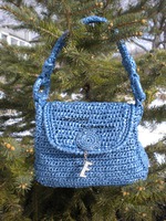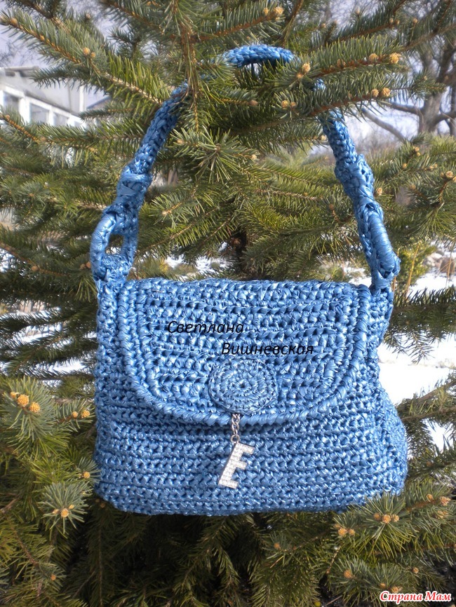 Связана она из дорогих перламутровых пакетов на 100 литров, других таких просто не встречала. Крючек №5. Нить шириной 2 см.