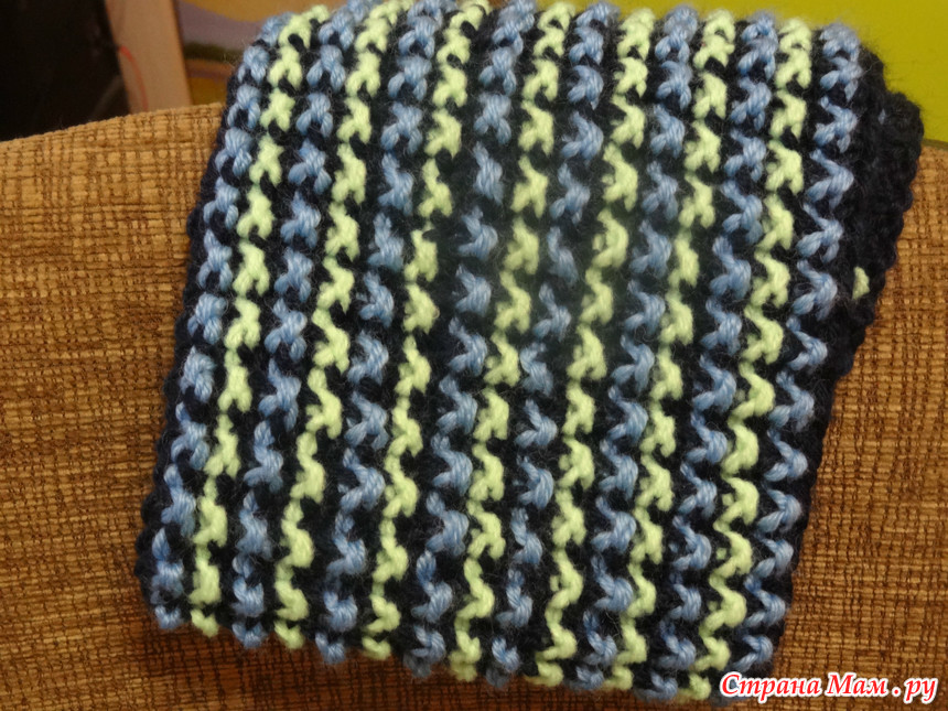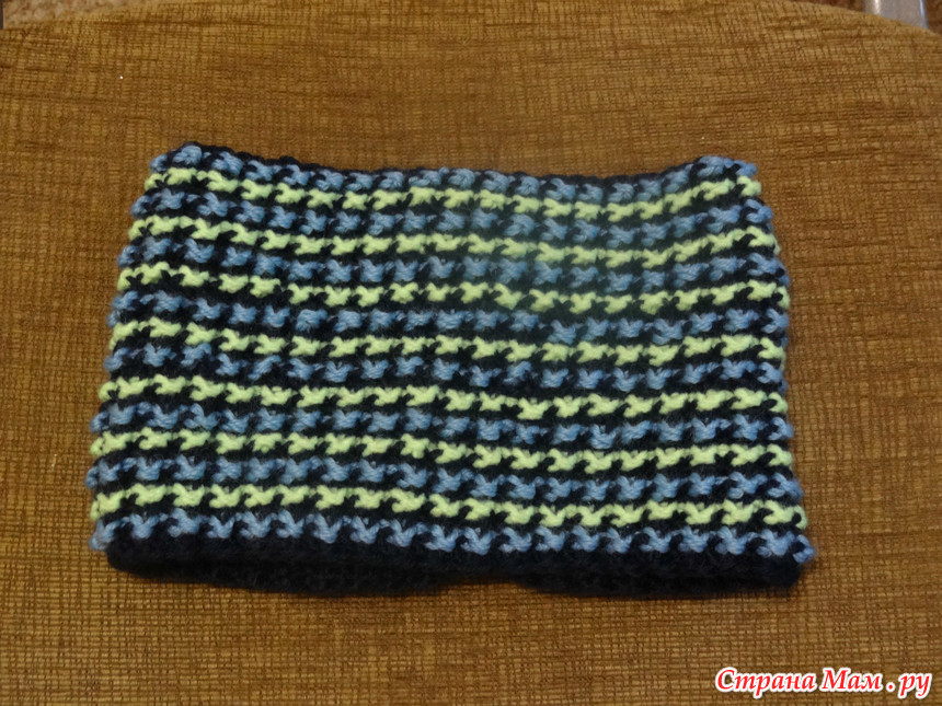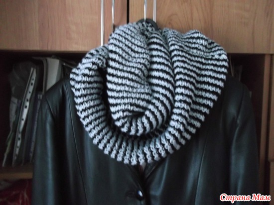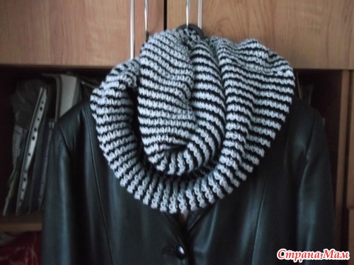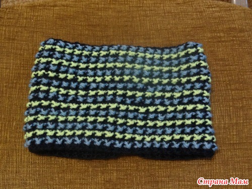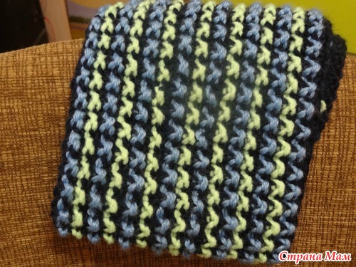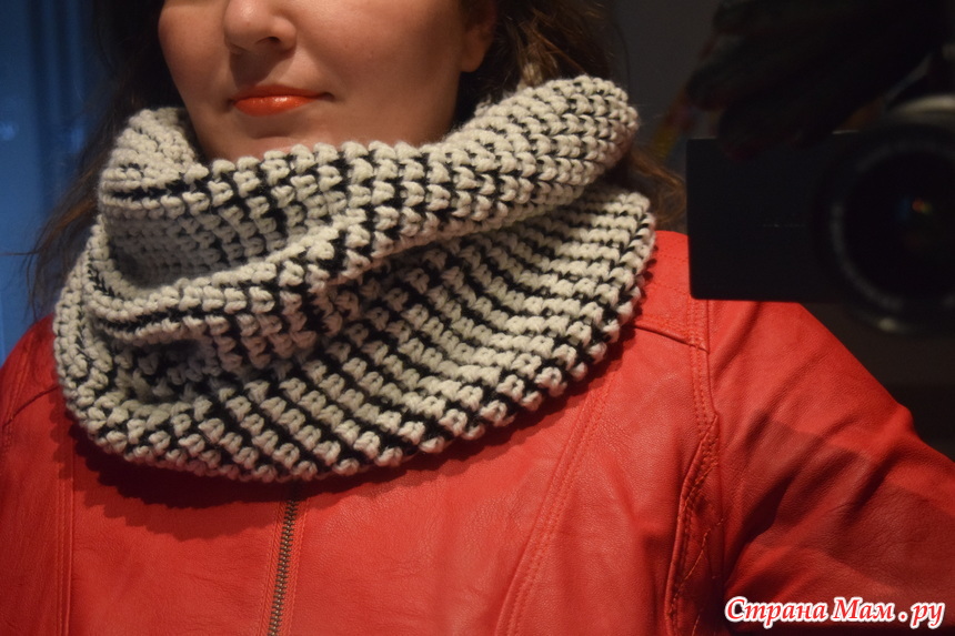 Особенности: вязала в 2 нити прямоугольник нужных размеров, потом сшивала и делала обвязку по одному краю. Ношу уже второй год, но сфотографировала только сейчас.
