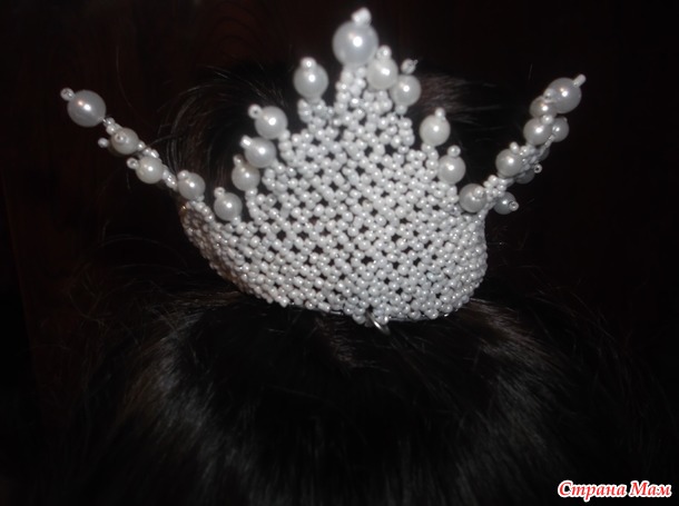 Доброй ночи мои рукодельницы. Наконец-то я представляю вам мою снежиночку. Заранее извиняюсь, что нет фото моей модели в костюме, потому что я ее снимала на видео. Принесет фото фотограф и вам представлю ее во всей красе. И не удержалась и сделала из бисера коронку на гульку своей любимой дочурке на танцы.